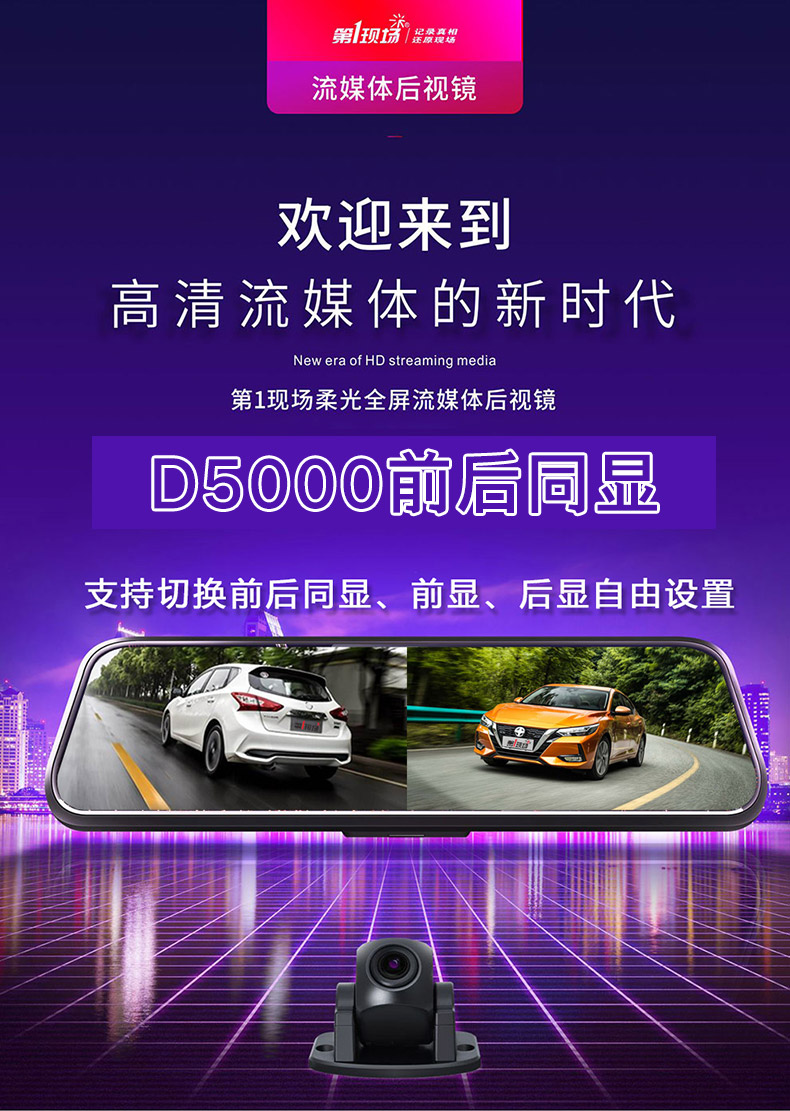 第一现场第1现场行车记录仪D5000无光夜视 9.66英寸触摸屏流媒体停车监控 流媒体/双录+64